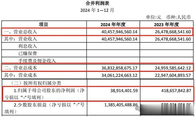 厦门国贸地产实现营业总收入404.58亿元,较2023年度264.79亿元,增长了52.79%;营业总成本为368.33亿元,较2023年249.6亿元,增加了47.57%;营业利润为16.69亿元,利润总额为16.87亿元,净利润为14.24亿元,归属于母公司股东的净利润为3891.44万元,较2023年4.19亿元,同比下降了90.69%。